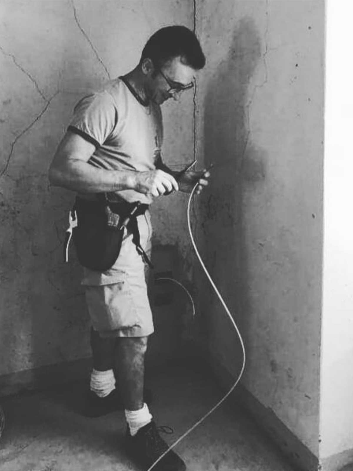 Andrea installing new electric cables in the Oak Room