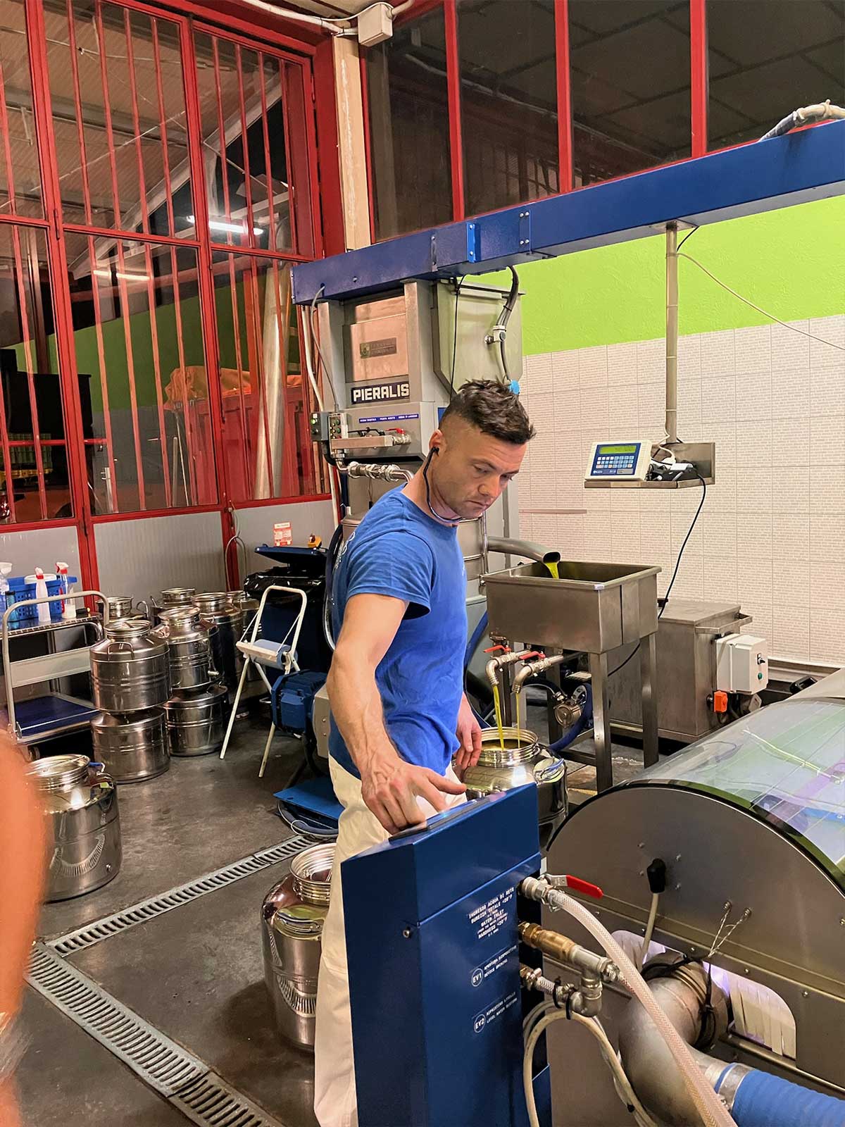 Giampaolo, co-owner, supervising the milling of Le Clarisse EVOO.