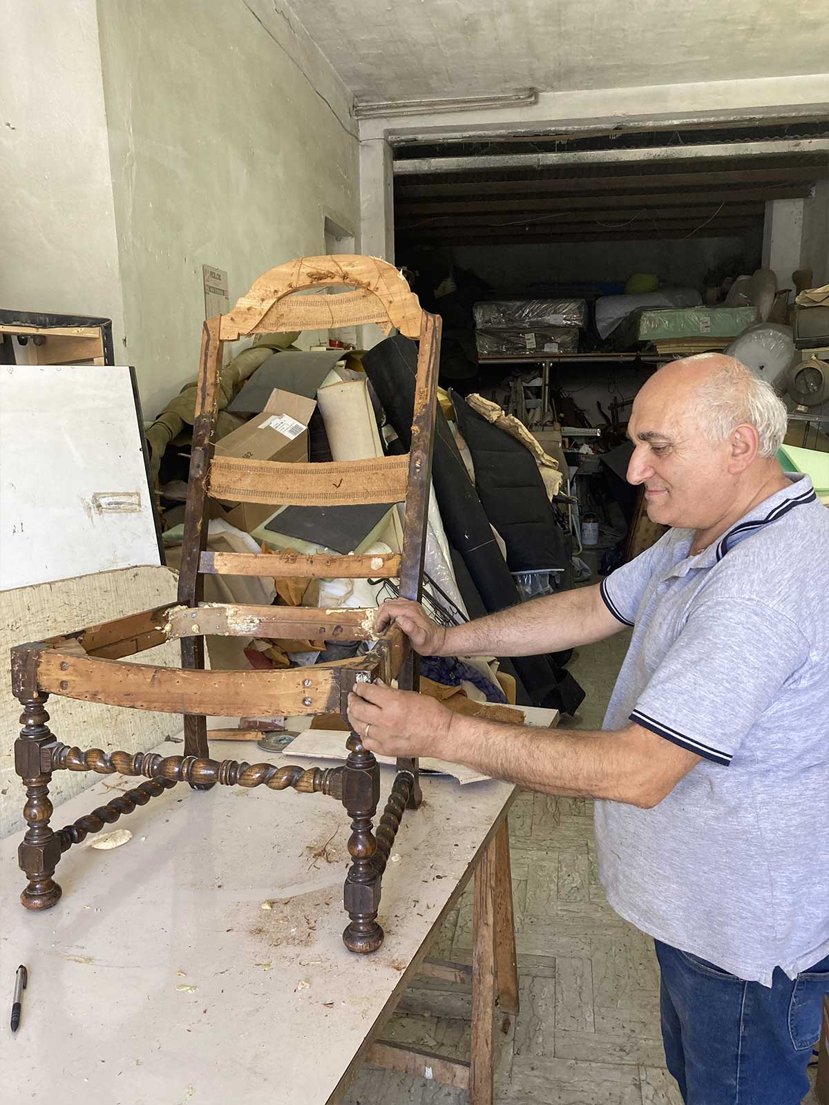 Giuseppe in his studio working on one of our salon chairs.