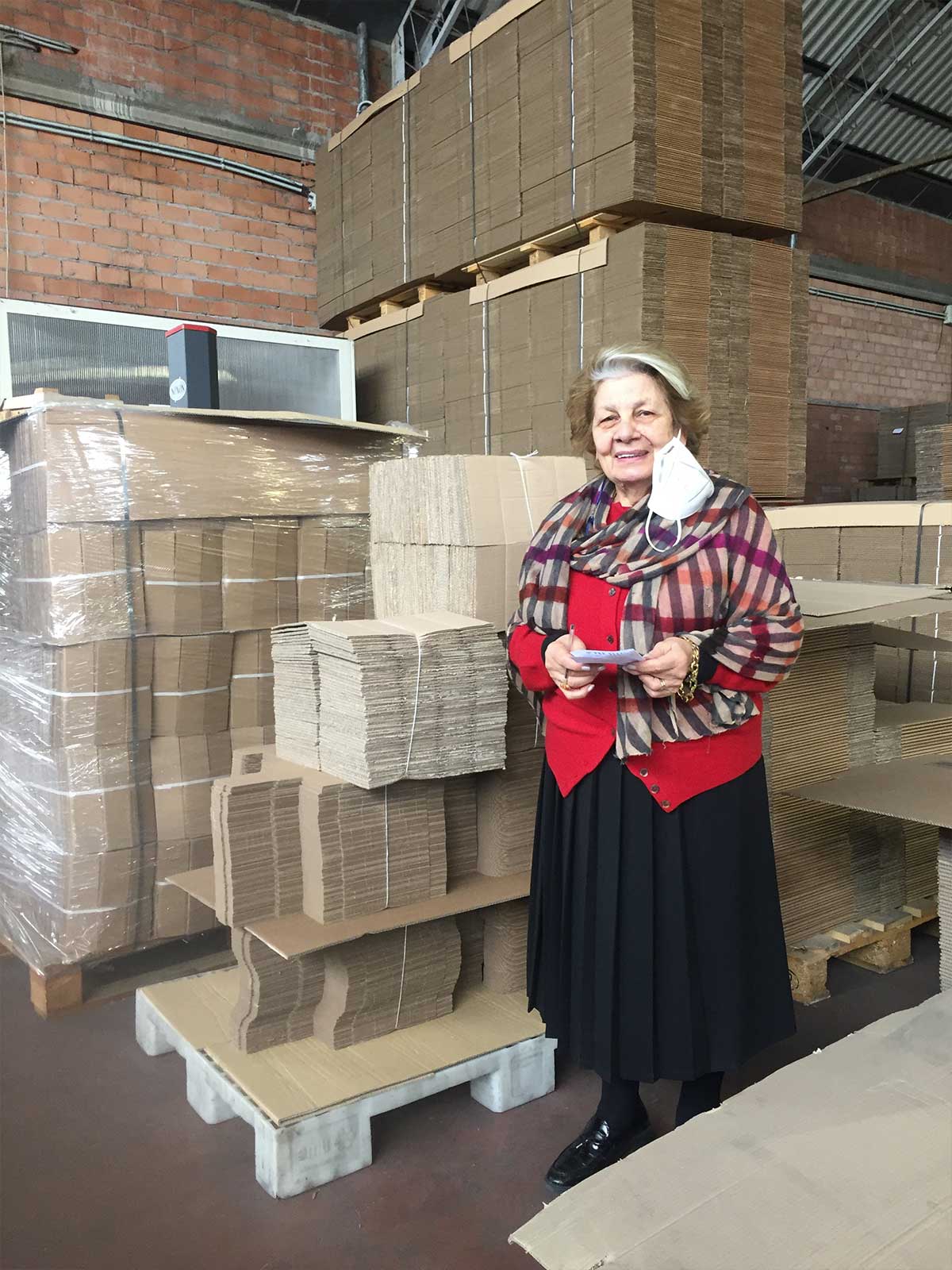 La signora Marisa, owner, supervising the delivery of Le Clarisse shipping boxes.